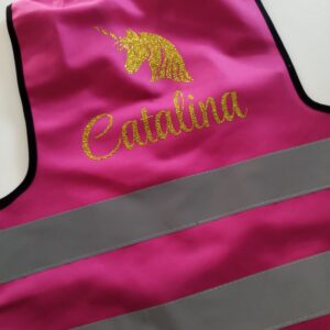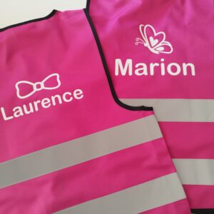 Kies zelf een icoontje (+1€) en het lettertype en kleur van de bedrukking en ga op pad met een roos fluovest met naam.