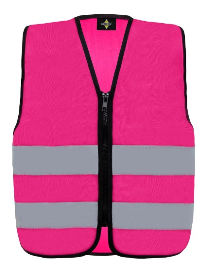 Kies zelf een icoontje (+1€) en het lettertype en kleur van de bedrukking en ga op pad met een roos fluovest met rits en naam.